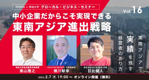NPO法人ZESDAは、2月7日(月)に第16回グローカルビジネスセミナー『中小企業だからこそ実現できる東南アジア進出戦略~東南アジアで実績を残す経営者のあり方~』を開催します。NPO法人ZESDAが明治大学奥山雅之研究室と共にお届けするグローカル・ビジネ…