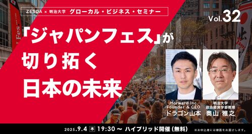 NPO法人ZESDAは、9月4日(木)にグローカル・ビジネス・セミナー vol.32をハイブリッド開催します。今回は、Jforward Inc. Founder & CEOのドラゴン山本さんをお迎えし、「『ジャパンフェス』が切り拓く日本の未来」というテーマでお話しいただきます。■「…